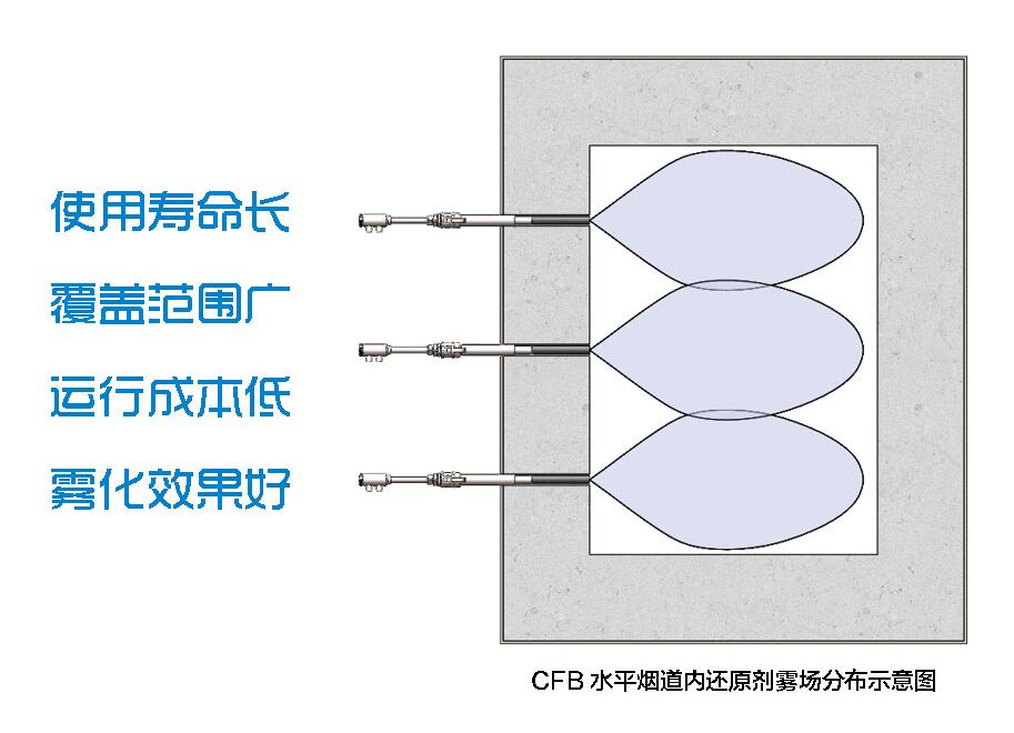 循環(huán)流化床鍋爐的水平煙道由于截面積小、煙氣溫度接近脫硝理想溫度,成為噴槍安裝的首選位置。我公司會根據(jù)現(xiàn)場實際情況和循環(huán)流化床水平煙道截面尺寸確定噴槍數(shù)量和布置形式,使還原劑霧場充分覆蓋煙道橫截面,確保還原劑與煙氣充分混合,從而達到最優(yōu)的脫硝效果。
